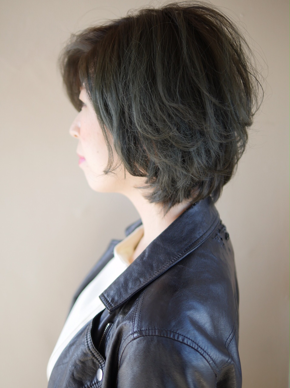 モード系のショートスタイル。かっこいい感じで大人っぽくキメるなら前下がりのレイヤーボブ。さらにグレー系のカラーでスキのないヘアスタイルにキマります。
