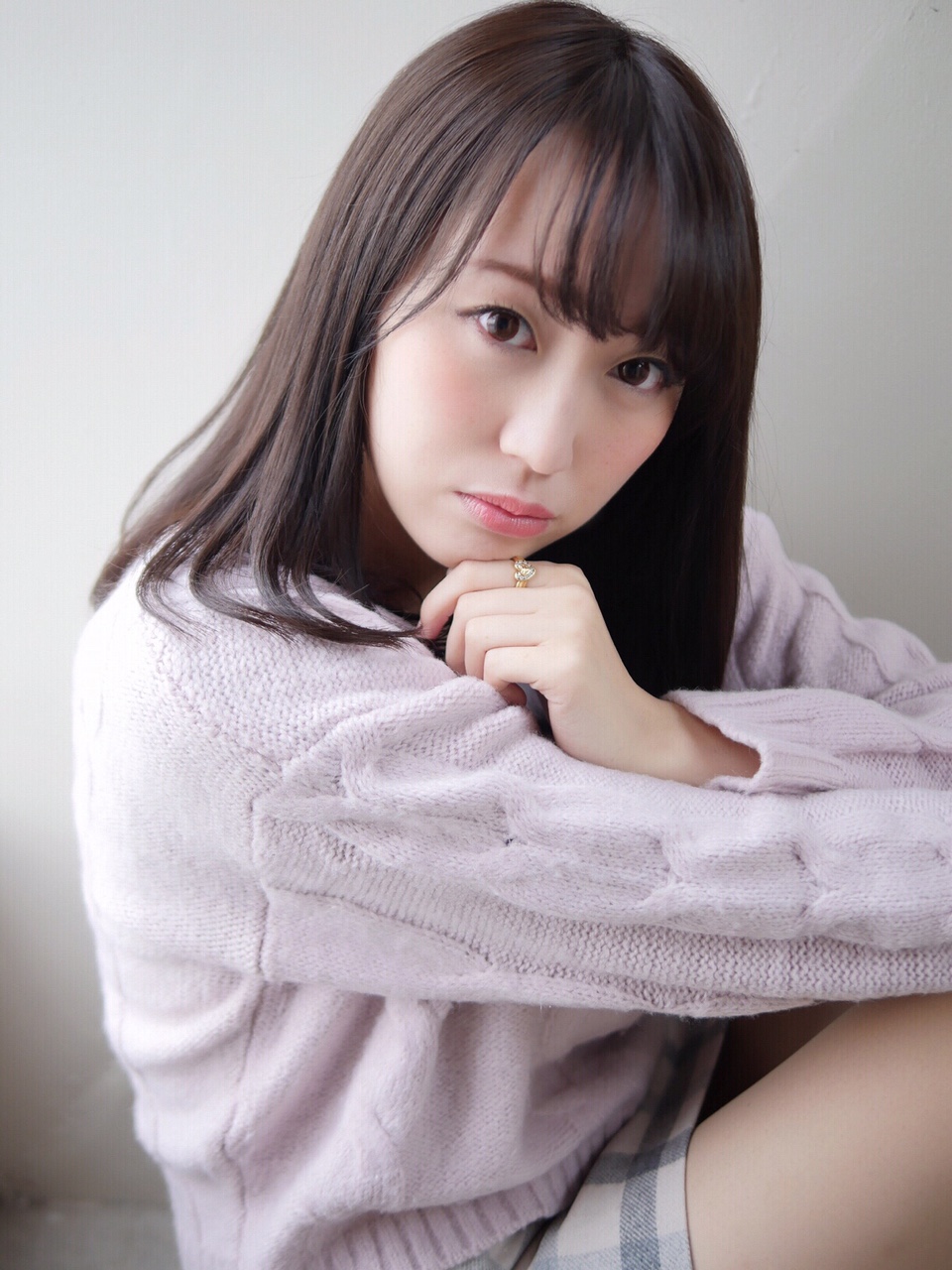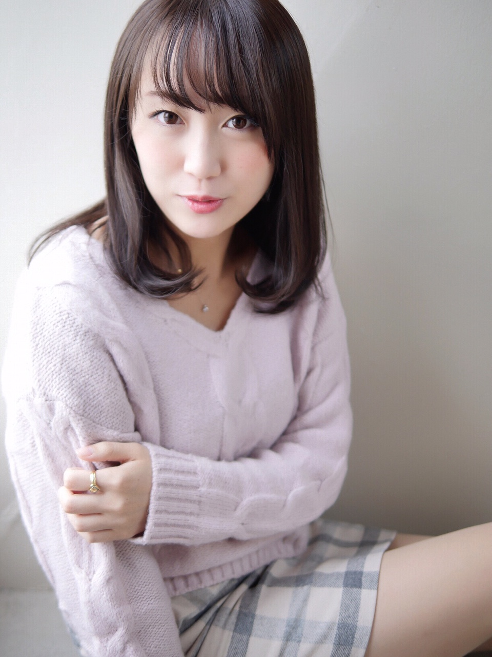 肩の長さのレイヤー少なめワンレンスタイル。前髪を作って毛先だけ巻いて清楚な印象に。暗めの柔らかめオリーブブラウンで男の子ウケ抜群です。