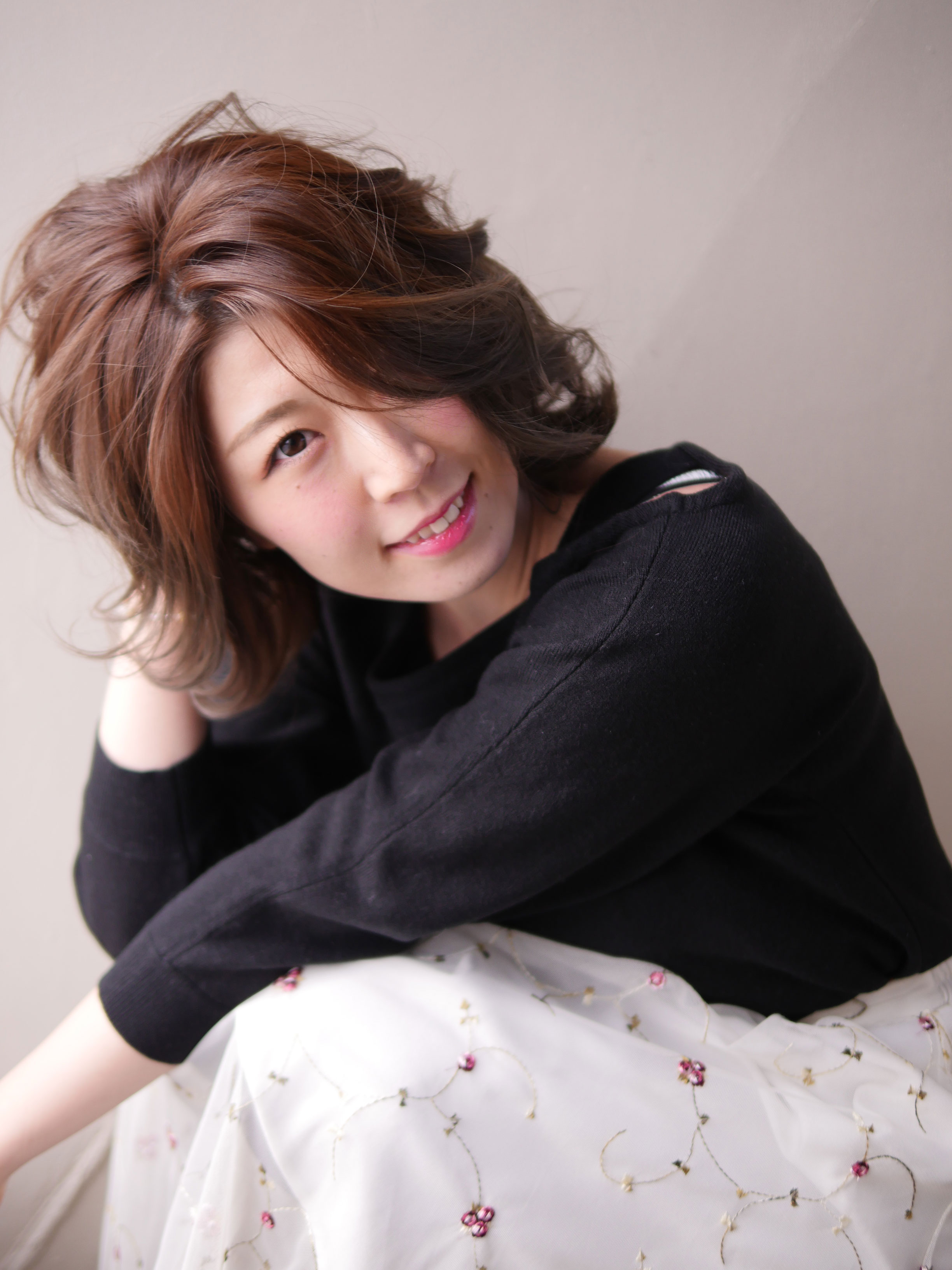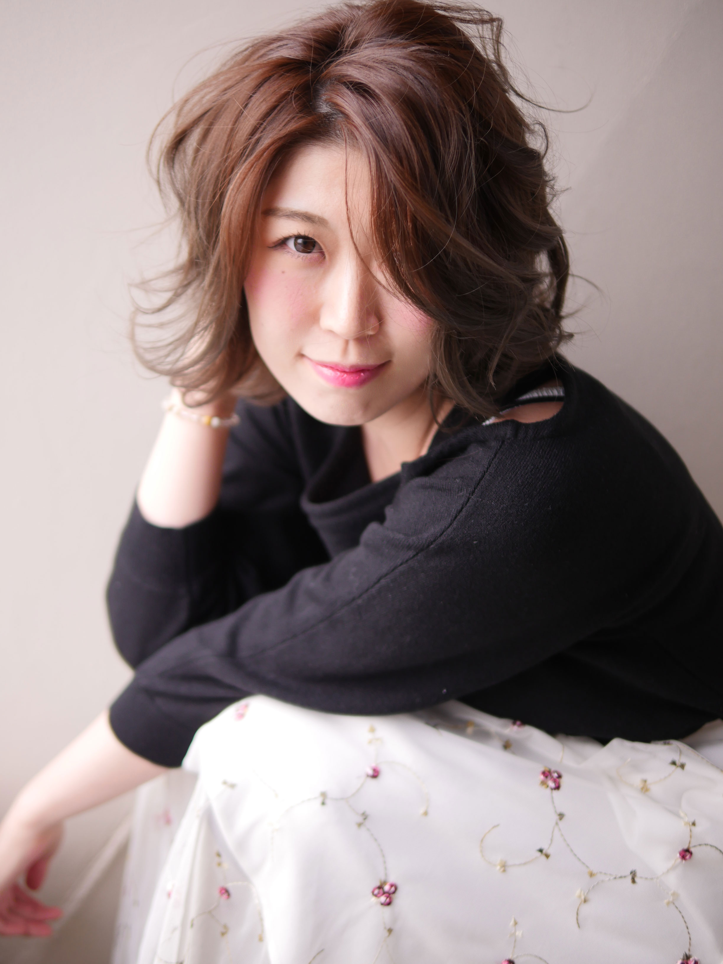 バング長めの大人のボブスタイル。コテを使ってミックスに巻いて自然なウェーブスタイル。パーマも楽ですが、まずはコテでバランスの練習をすると本当の意味でスタイリングが楽になります♪