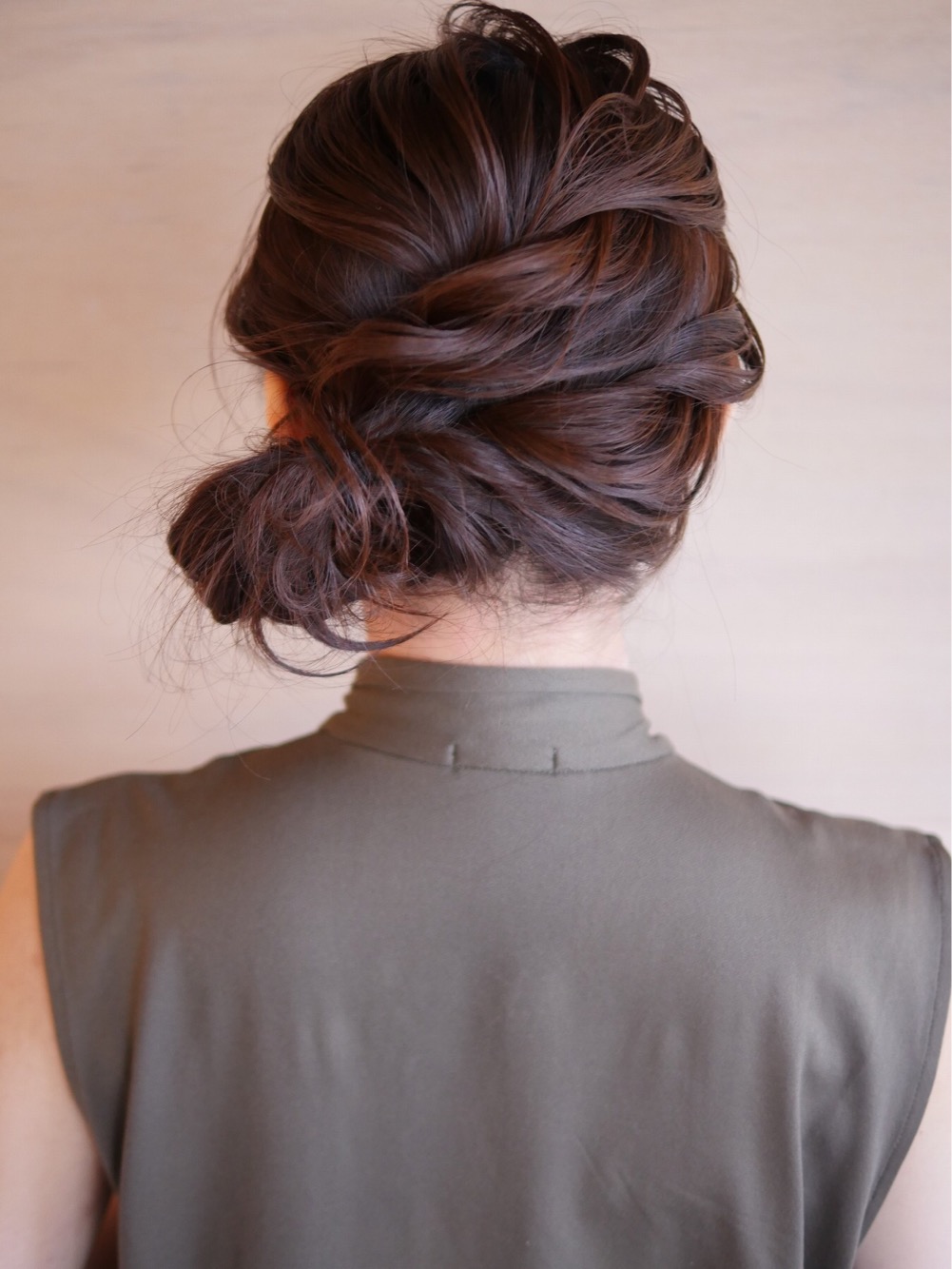 サイドにねじって毛先を丸めます。普段のアレンジにもパーティーにも使えます。