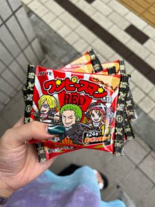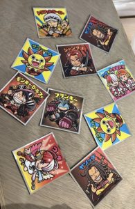 たまたまコンビニで見つけたワンピースとコラボしたビックリマンチョコ、ゾロがほしくて5個買っちゃいました➰