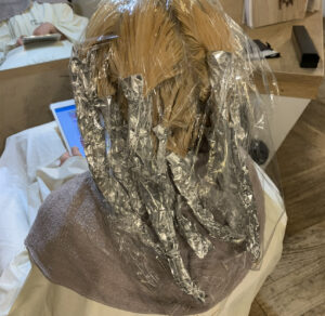 その場合は毛先のブリーチ力を高めるためにホイル巻き。