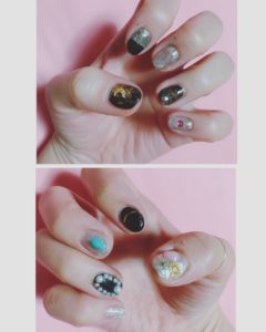 やっぱりブラックネイルが好きなので暗いけど、可愛く見えるようにパールやらなんやらつけてみました♪