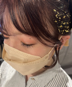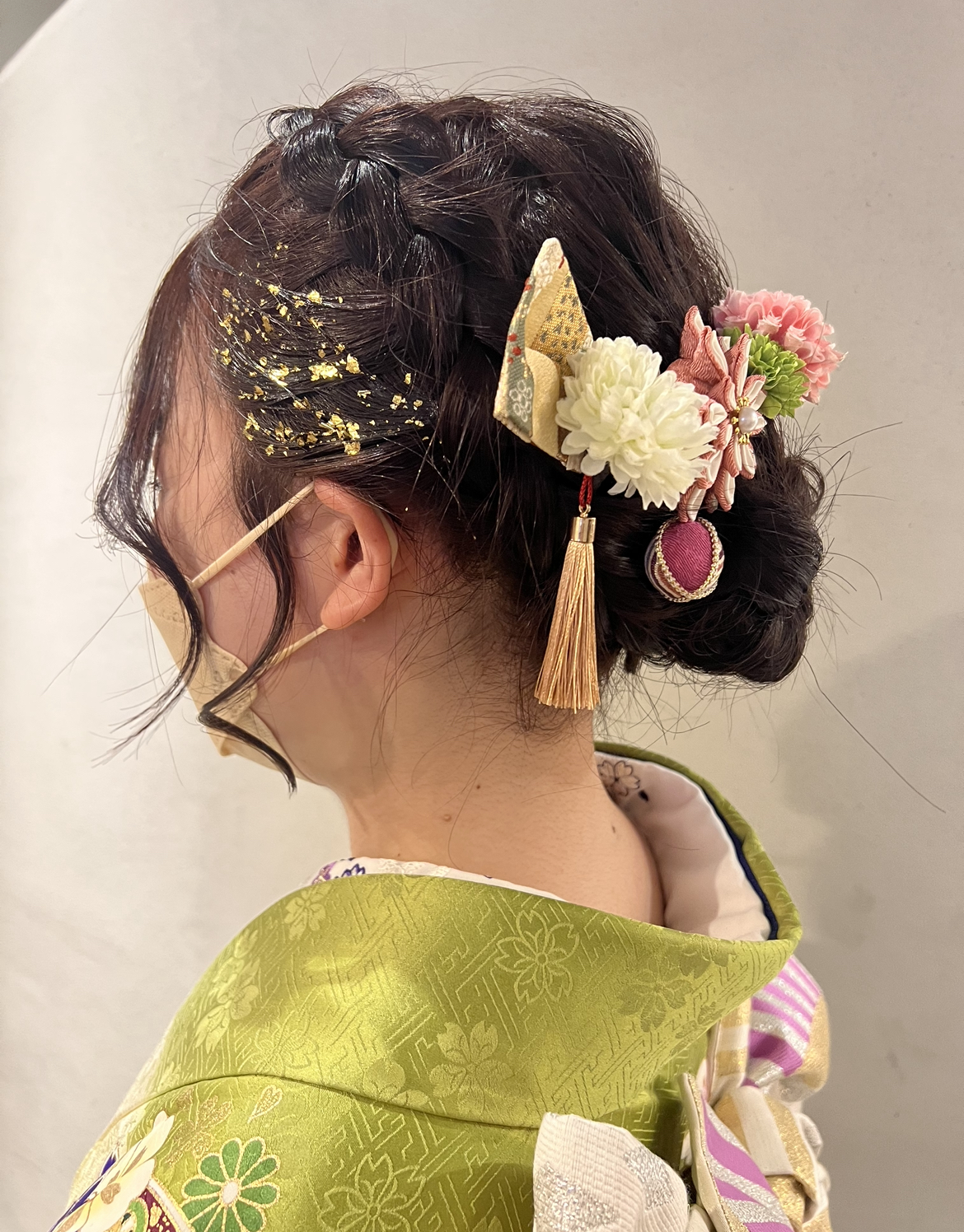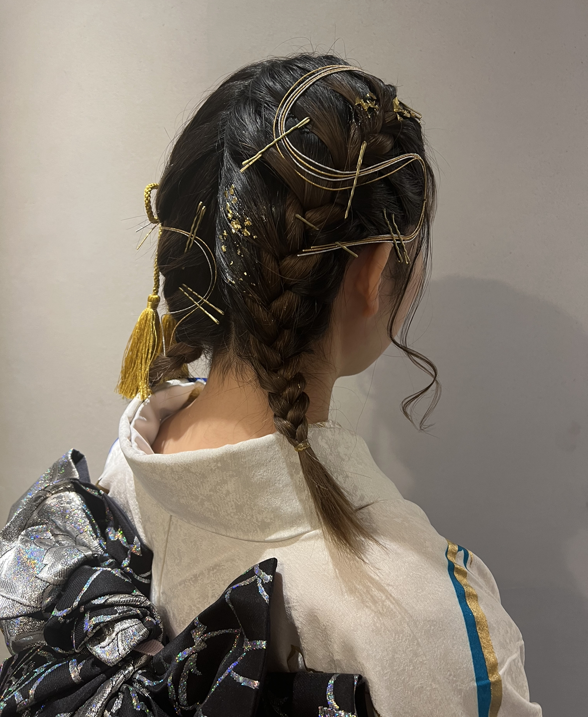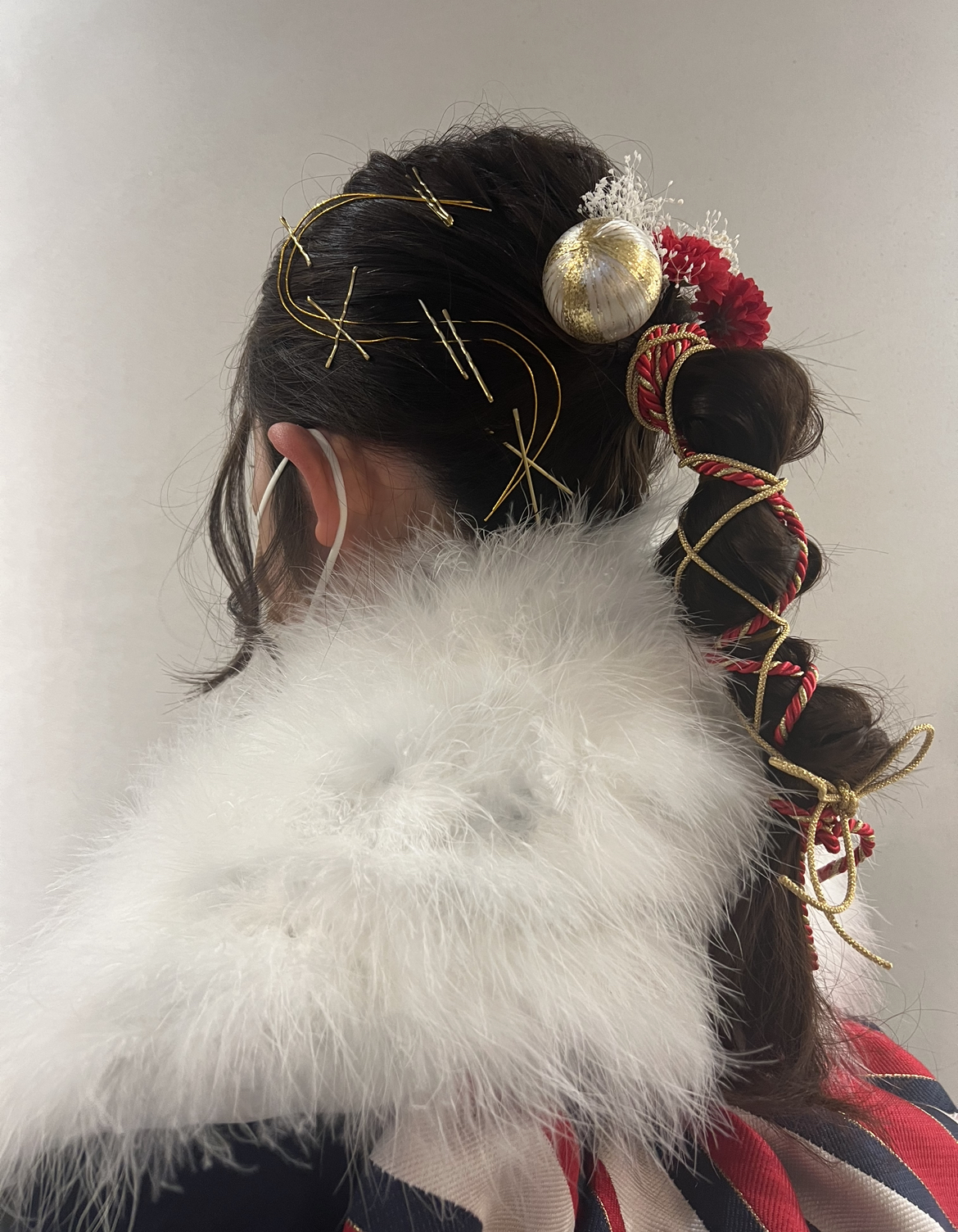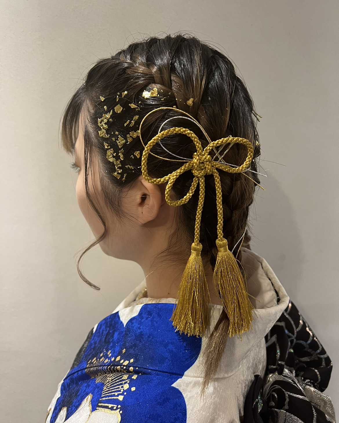 紐、水引、金箔を付けたヘアセット