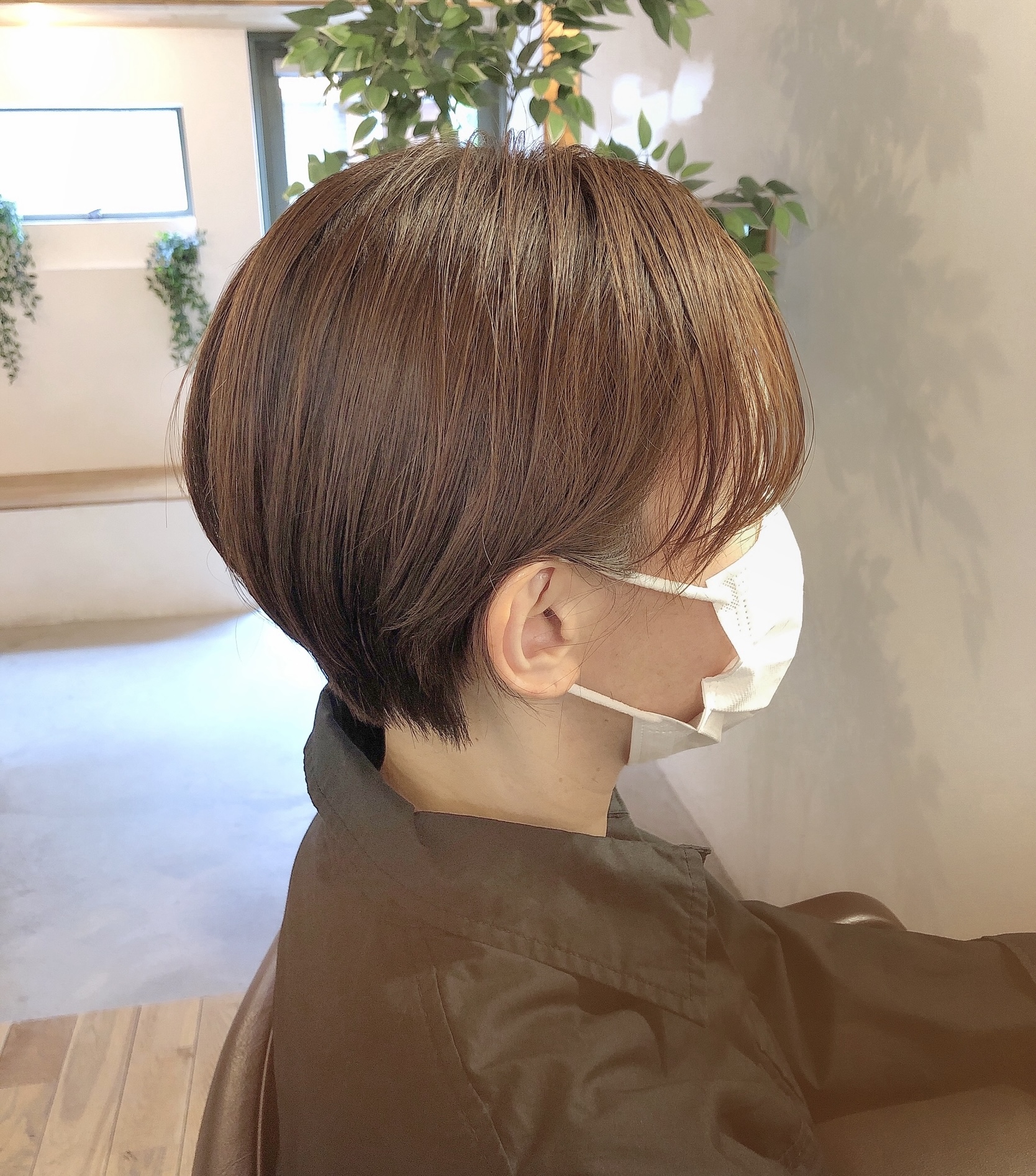 襟足は短めで前髪は少し長めの丸みのあるシルエットのショートです